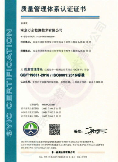 南京萬全檢測技術(shù)有限公司,籌建于2013年1月,注冊資金500萬,公司坐落于南京經(jīng)濟技術(shù)開發(fā)區(qū)興智路6號興智科技園A棟17層,實驗室占地面積1750余平米。公司是一家獲得省級CMA計量認證資質(zhì)、具有獨立法人、政府認可的綜合性、專業(yè)性的檢測機構(gòu)。環(huán)境監(jiān)測業(yè)務(wù)是其重要的檢測業(yè)務(wù)之一,目前已獲得省級計量資格認可項目314項,設(shè)備齊全,具有較強的技術(shù)能力。